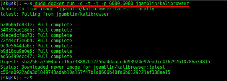As you see in the above output, Kali Linux docker image id is c564a0922a6a.CONTAINER ID IMAGE COMMAND CREATED STATUS PORTS NAMES c564a0922a6a jgamblin/kalibrowser "/bin/sh -c /startup." 6 hours ago Up 6 hours 0.0.0.0:6080->6080/tcp sharp_bartik
